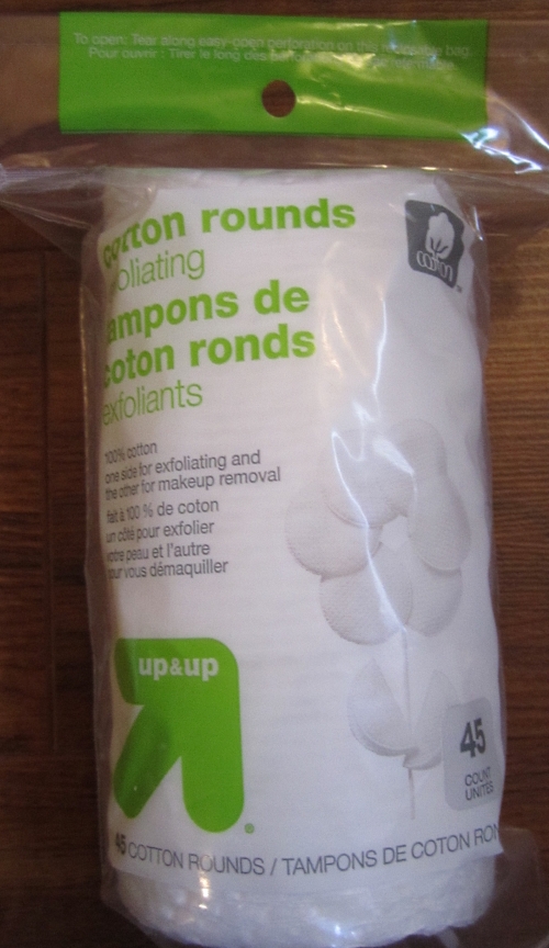 I bought 10 bags of the up&up exfoliating cotton rounds, 45 count each ($2.69 per pack). The up&up brand is Target’s private label brand, and I have never seen another brand offer an exfoliating cotton round similar to this. I use this about once a week – at this rate, the 450 pieces will last me almost 9 years. A woman spied my basket full of these and asked if they were on clearance. Nope they aren’t, I just love them so much that I need to stock up on (ahem hoard) them.