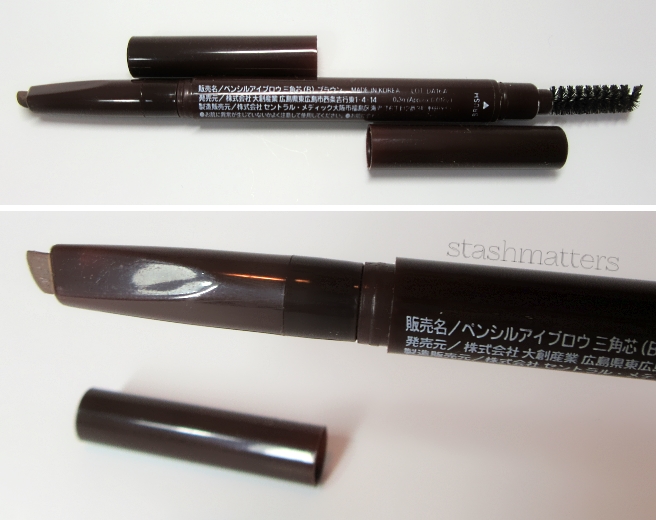 I bought this in Japan from Daiso which is their dollar store. This was surprisingly good. It’s similar in appearance to the Shu Uemura Brow Sword which I reviewed here. I found the colour to be slightly warmer than what I normally wear but it worked fine for the summer months. I did find the formula to be ever so slightly waxy which sometimes stuck my brow hairs together. It took me about 2 months to use up this pencil – I guess for $1, it’s not bad at all. This product was made in Korea.