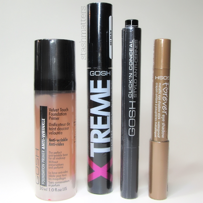 I recently learned that SDM is phasing out the GOSH line, which is a shame. I never did like their bestselling product, the Velvet Touch eyeliner (it smudges on me and migrates into my eyeballs), but they had some good products like their mascaras, nail polishes, and lipsticks. I suspect that GOSH never really caught on here due to their price point – at the highest range of drugstore prices. I spied a clearance display with 50% off all of their remaining products and since I can’t resist deals, I picked up: